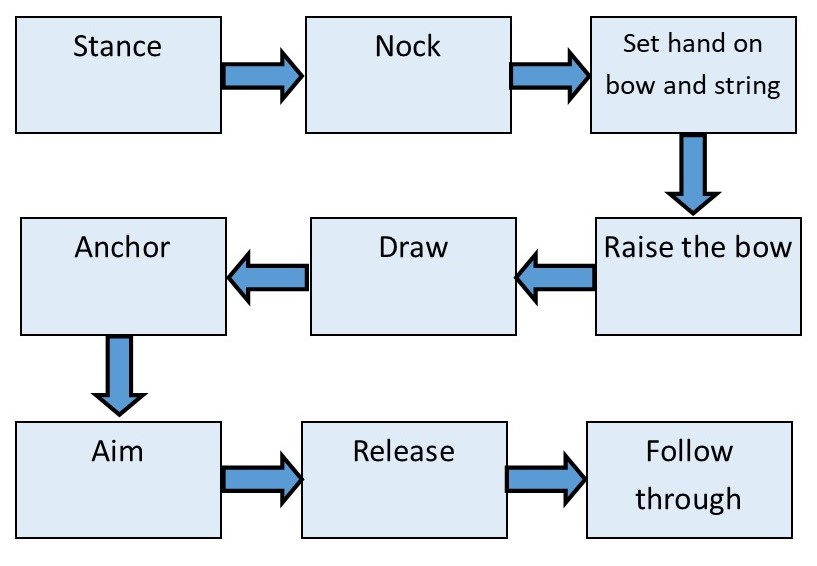 Below is the simplest breakdown of the typical shot cycle in archery sometimes called The Nine Steps: